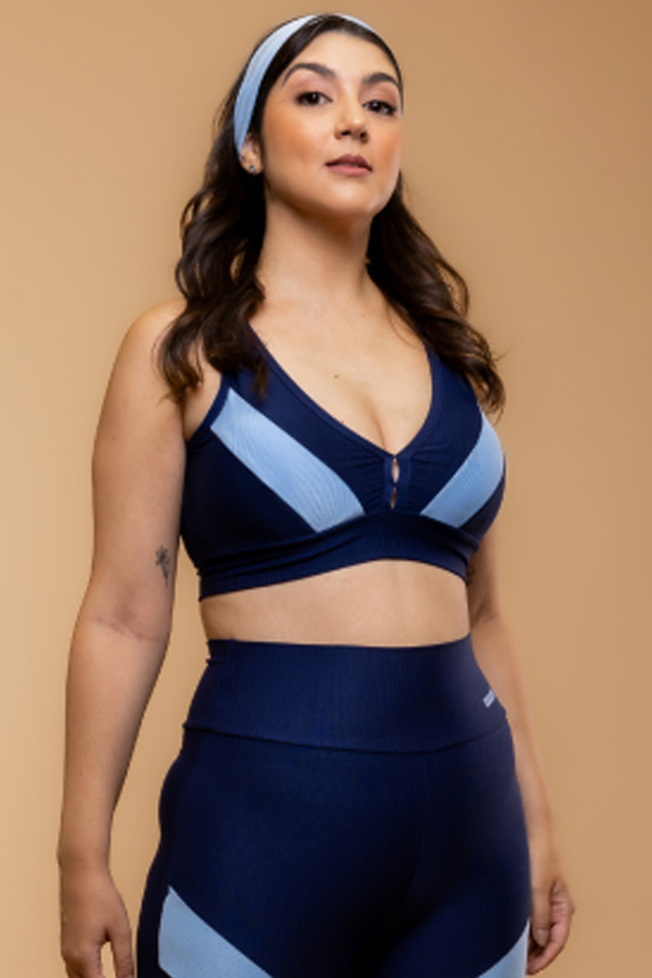 A legging possui recortes em branco nos bolsos das duas pernas, e detalhes em tramas pretas, uma combinação de cores e relevos que proporcionam