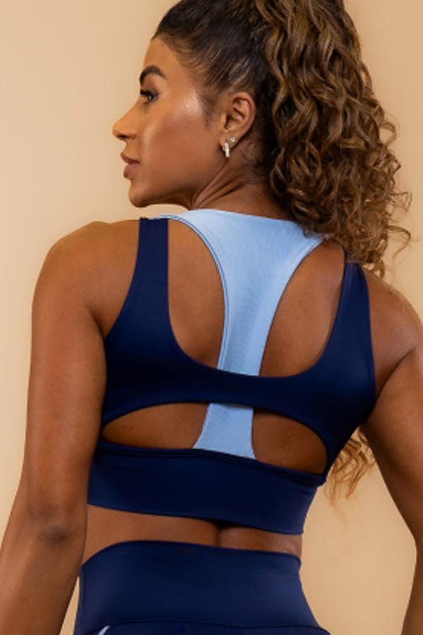 Com o design dinâmico tendo a frente de um top e as costas de um cropped, o Top Glide possui alça dupla e recorte nas costas, destacando a escrita da marca.